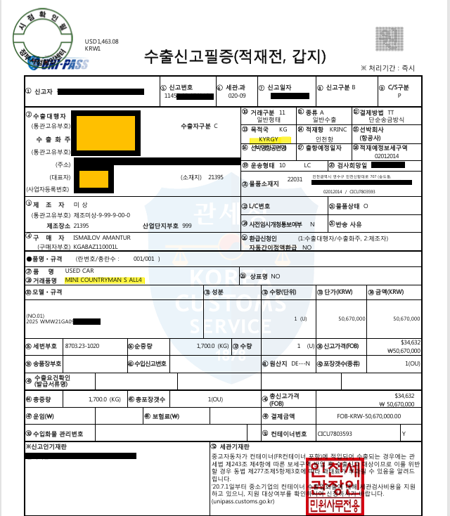 키르기스스탄 시장을 대상으로 BMW MINI COOPER 차량 수출을 성공적으로 완료하였습니다.
